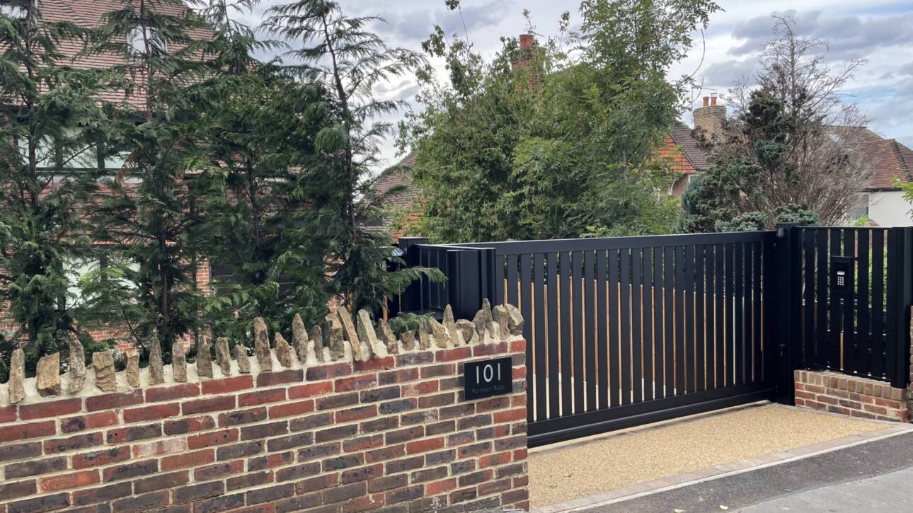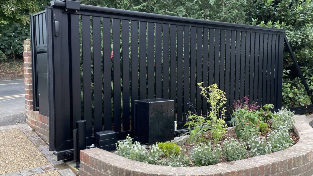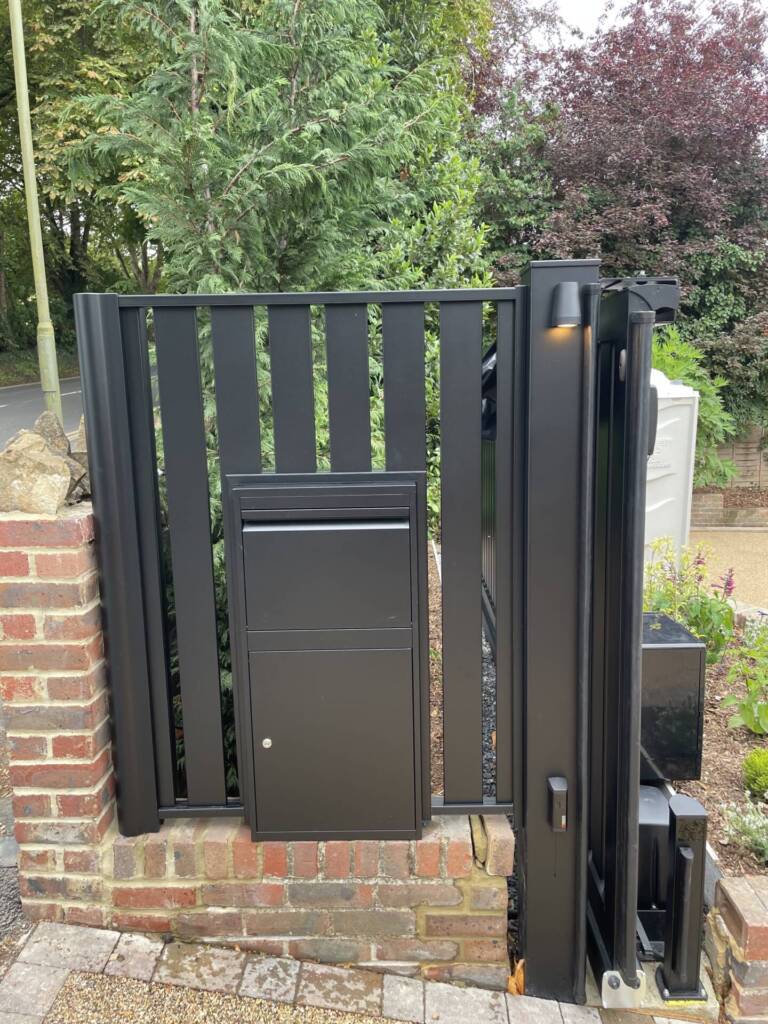 The solution was a bespoke cantilever sliding gate featuring vertical slats constructed from precision-engineered aluminium. This was accompanied by matching fence panels either side, an in-built post and parcel box, an intercom, and a custom-built enclosure with control panel.