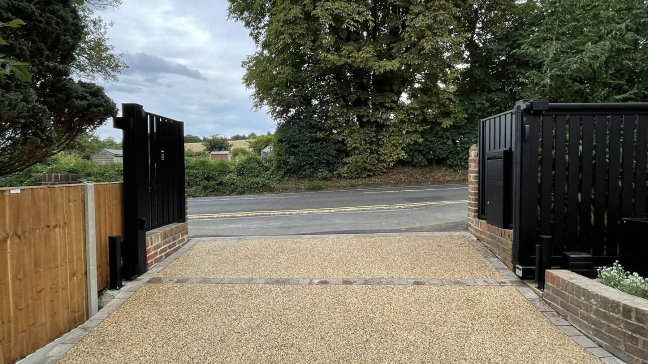 The most significant challenge was the topography of the property. The boundary slopes noticeably from one side to the other, while the driveway descends sharply toward the house. Swing gates were therefore impractical, as the falling gradient would cause clearance issues. A cantilever design (where the gate leaf “floats” across the drive without relying on ground tracks) was the ideal solution. This avoids conflicts between the gate movement and the uneven terrain and ensures smooth travel along the cantilever track.
