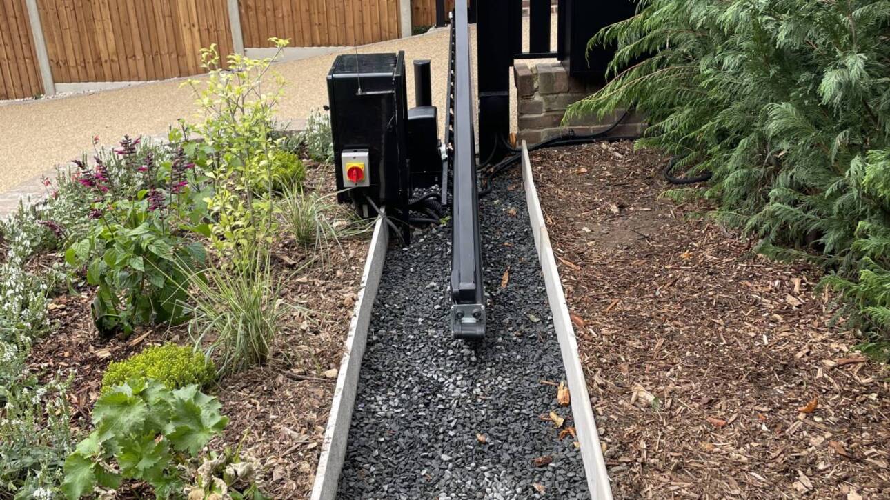 Although cantilever systems excel in sloped environments, they still require the gate’s travel path to remain consistent and correctly aligned. Achieving this on a changing gradient necessitated exact calculations and careful installation of the foundation plinth.